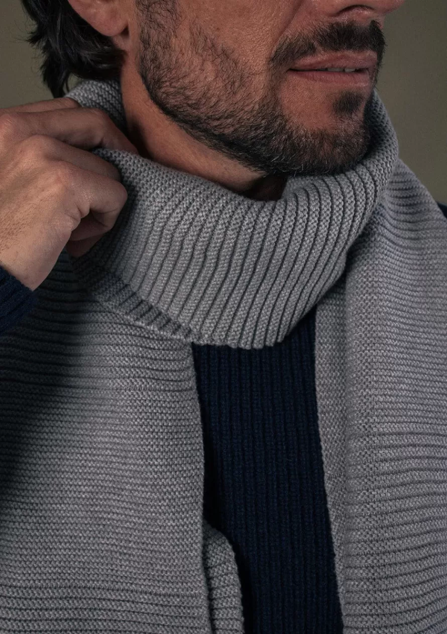 Avec son jeu de maille en coton bio, l’écharpe PENSEUR, dans son beau gris clair intemporel, vous accompagnera facilement sur tous vos looks d’automne-hiver.