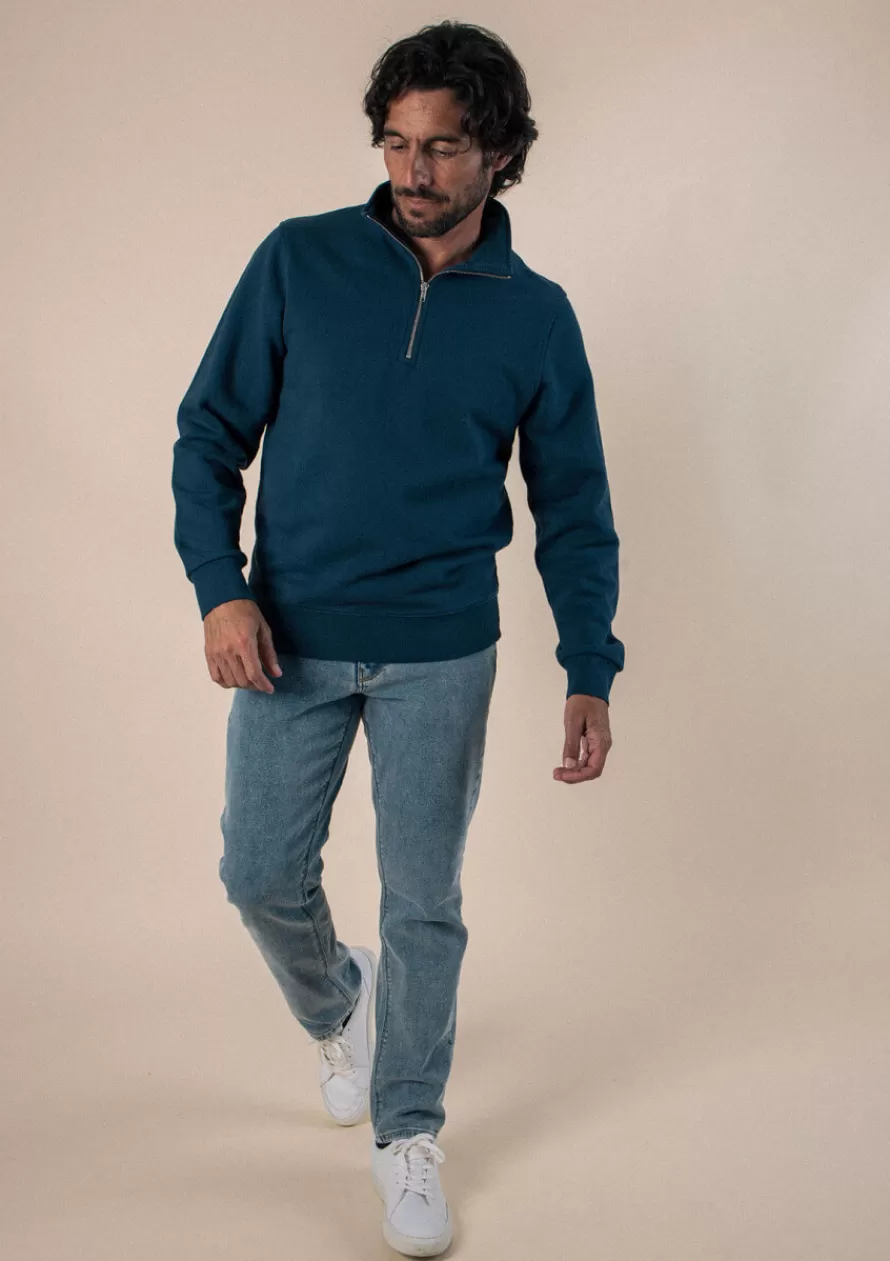 Le sweat UNION bleu et son col camionneur conjugue confort et élégance. Portez-le avec notre jean THOMAS et nos baskets blanches.